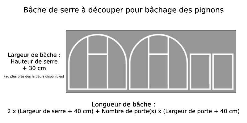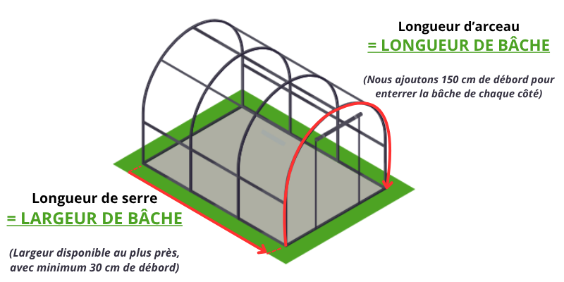 Choisir les bonnes dimensions pour sa bache pour serre de jardin Nous coupons votre bache de serre à la longueur de votre choix, à partir d’un choix défini de largeurs (de 3m à 15,50m), Vous pouvez poser votre bâche dans le sens de la longueur de la serre (= longueur de la bâche), ou bien de sa largeur (= longueur de la bâche). Pour calculer ses dimensions et assurer une bonne fixation, il faudra veiller : – A ajouter 15 cm pour chaque pignon, soit 30 cm. – A ajouter 75 cm de chaque côté pour enterrer la bâche, soit 1,50m. Si vous ne souhaitez pas enterrer votre bâche (non recommandé) et simplement la fixer aux entretoises, alors 25 cm de chaque côté suffisent.