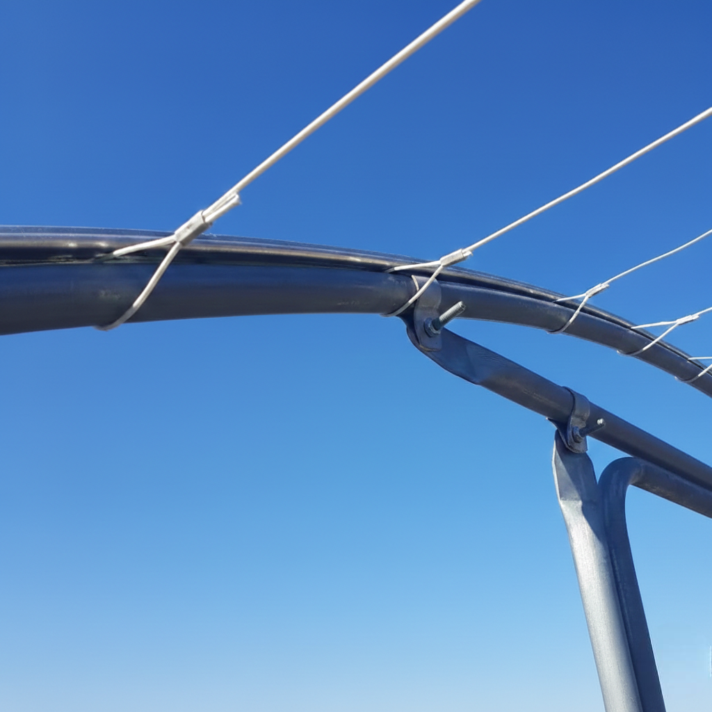 Tendez votre fil polyester sur votre serre, faites une boucle autour d’un arceau en prenant soin d’insérer un manchon au préalable, puis faites revenir le fil dans le manchon. Pincez le manchon à l’aide d’une pince et le travail est fait !